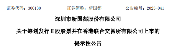 来自深圳南山区的A股上市公司新国都(300130.SZ)发布公告称,为深化公司全球化战略布局,加速海外业务拓展,构筑国际化资本运作平台,拓宽多元化融资渠道,有效增强公司全球资源配置能力和国际市场竞争能力,助力公司深度参与全球数字支付生态系统建设,公司拟发行H股股票并申请在香港联合交易所有限公司主板挂牌上市。